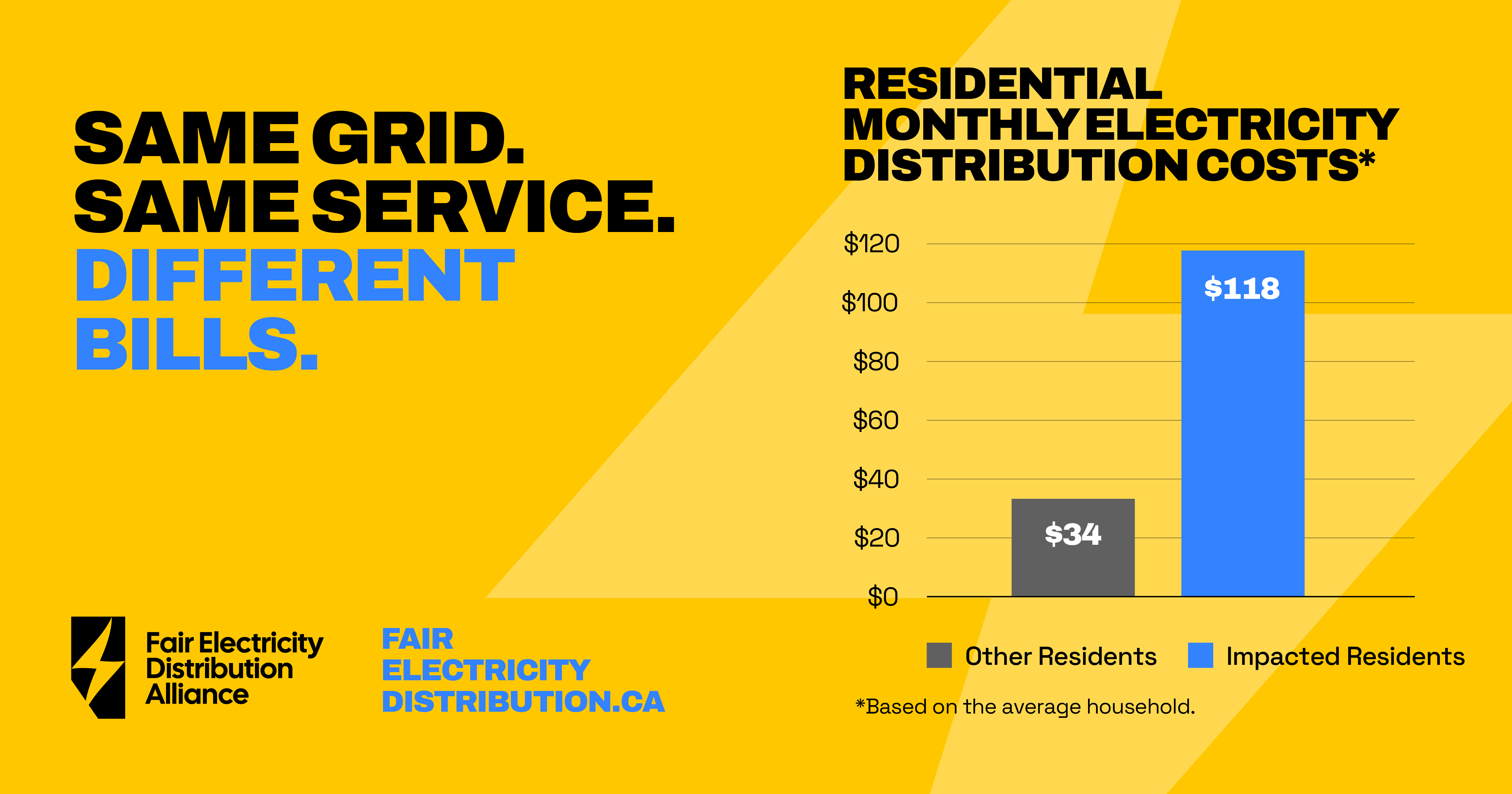 Right now, residents, businesses, and municipalities in northern, east-central and southern Alberta pay significantly higher electricity distribution costs than the rest of the province. Households pay an average of $118 a month, compared to about $34 in non-impacted service areas. For many businesses, distribution fees can be nearly three times as high as in other service areas.